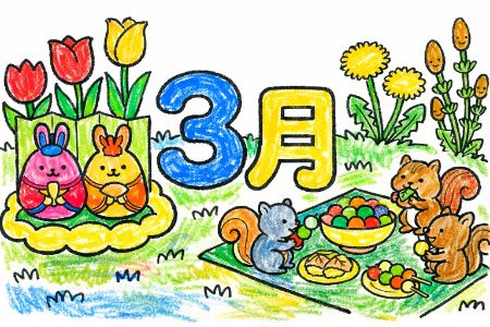 3月といえば「ひな祭り」。うさぎのお雛様とお内裏様が仲良く並んでいます🎎 その横では、チューリップやタンポポなど春の草花に囲まれて、可愛いリスさんたちが三色団子や桜餅を持ってお花見を楽しんでいますね🍡 春のワクワクするような雰囲気が伝わってきます。